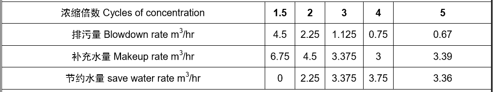 根據(jù)水質(zhì)分析,我們認為系統(tǒng)可以做到4倍濃縮,假如濃縮倍數(shù)從1.5倍濃縮到4倍,按照240天(運行8個月)的開機率,循環(huán)水每年節(jié)約用水量約為3.75*240*24 = 21,600 (m³/年),水費按照4.15元/m3計算,每年節(jié)約水費26,600*4.15=89,640元(此數(shù)據(jù)僅為濃縮4倍時的結果,如果濃縮5倍,結論數(shù)據(jù)將會更大)。