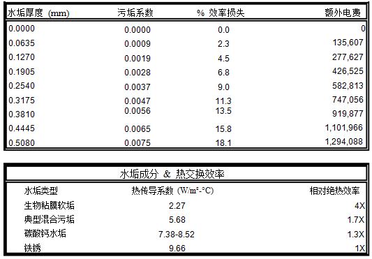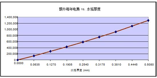 上圖是各種不同的水垢的熱交換效率參照表。并且是以一臺800Tons的冷凍機為例,假設由于水處理的問題,導致冷凍機冷凝器結垢,水垢厚度假設僅僅只有0.016毫米(相當于一張普通A4紙厚度的1/8),那么每年將額外增加電費316,795.00元。